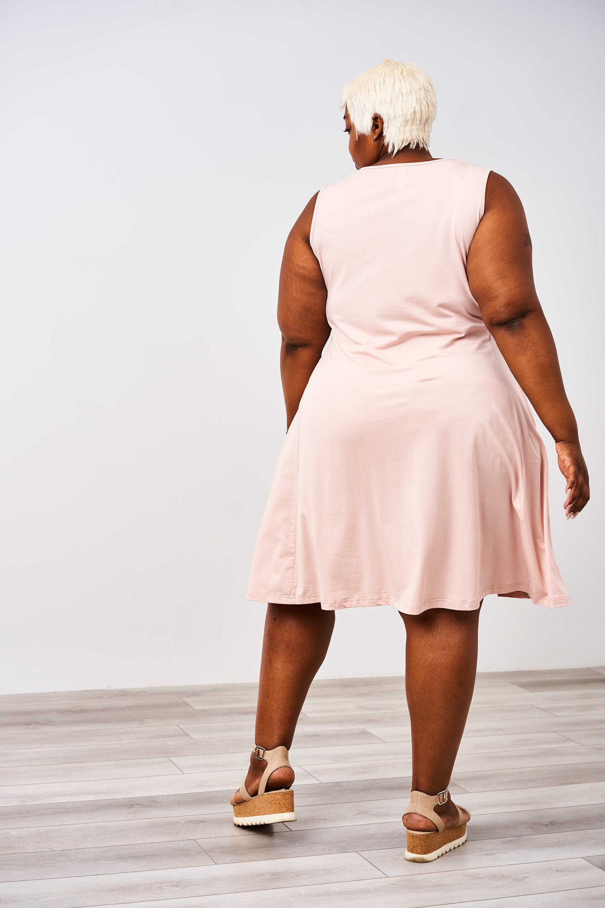 The material of the dress is very soft, and I love how it fits. I also own this dress in blue (the blue I would give 4 or 5 stars). The blush receives 3 stars because I wish the material was thicker or better quality. The outline of my bra can be clearly seen in the back, and the front bust lining is a bit awkward and tricky to get it to lay properly.