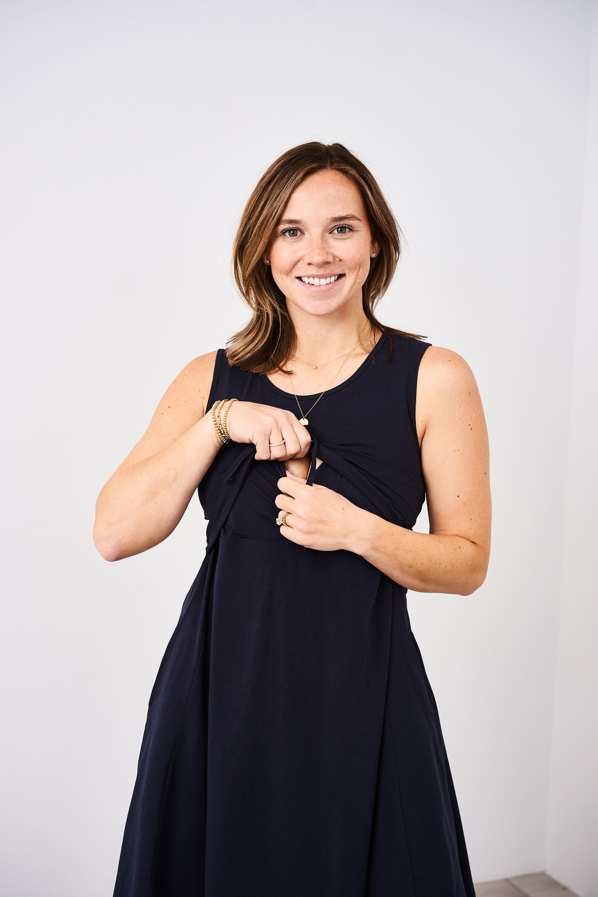 My toddler daughter said "Your dress! I like it! Pretty Mommy pretty!" Without prompting when I put on this dress in Navy! My husband said "Wow! I like it too!" I love the comfortable, flattering style, with pockets and easy access for breastfeeding in a dress! My baby loved rubbing his hands on the soft fabric while nursing. I'm glad I already bought it in 2 colors.