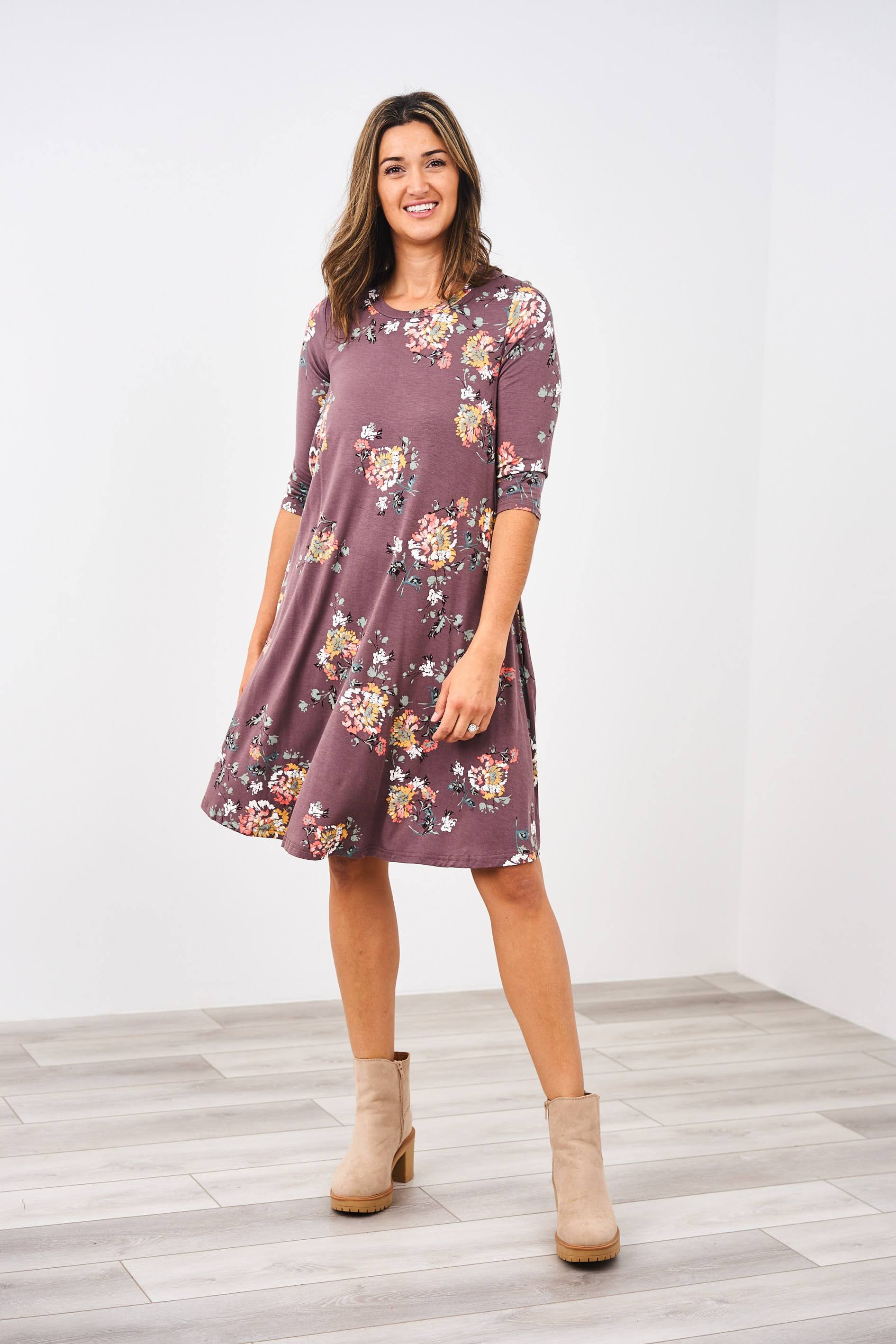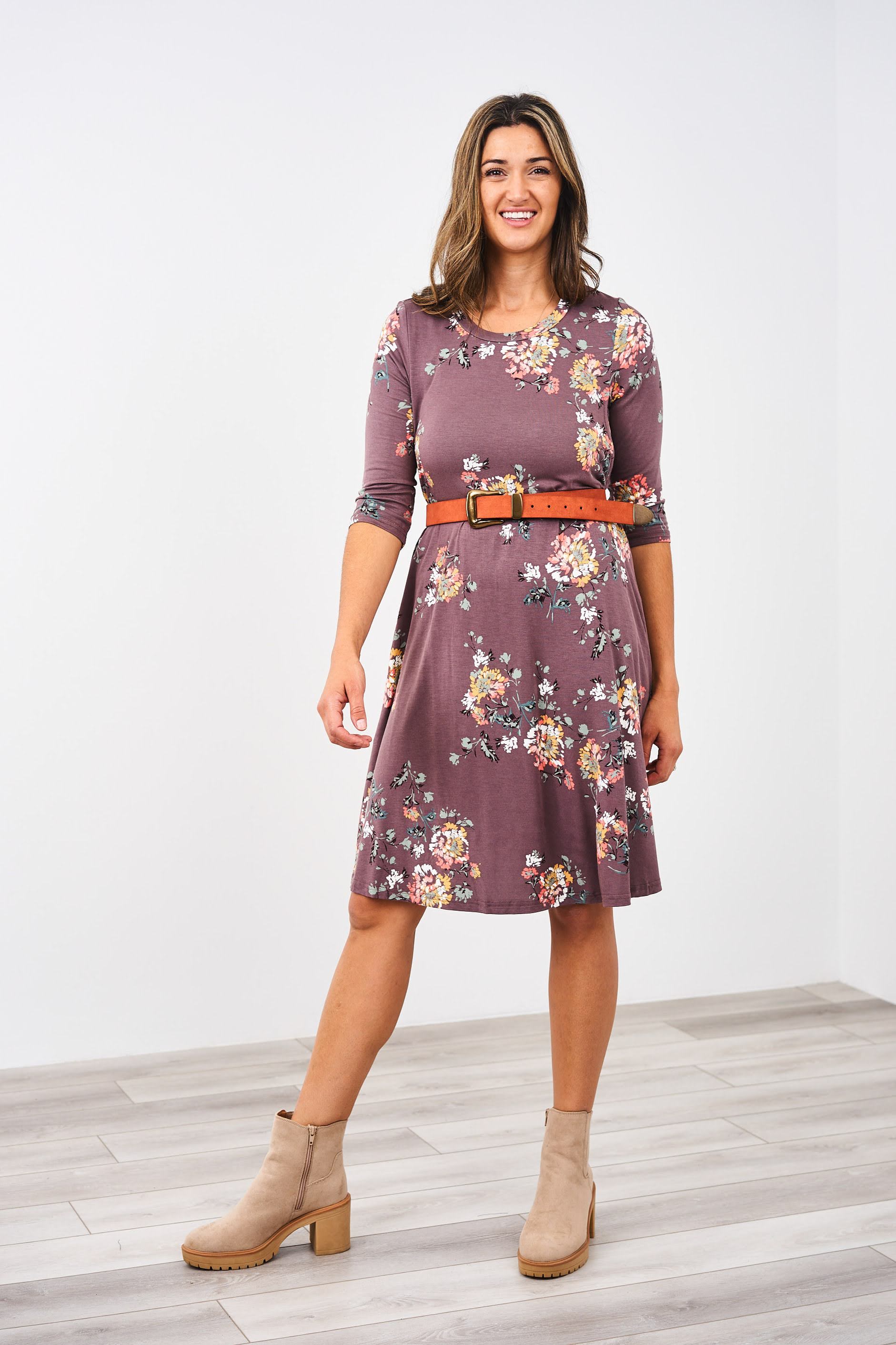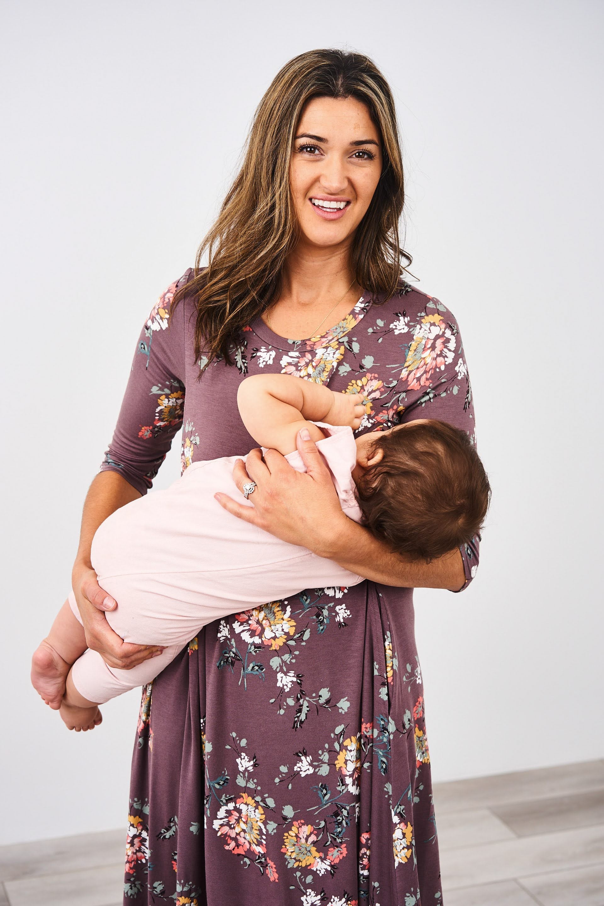 A super simple transitional dress that you can lounge around your house in, wear to work, the park or date night out! This dress features flattering elbow-length sleeves, easy side nursing access, and a flowy silhouette that's perfect for layering! A knee-length* style makes it easy to run around with your busy babies!