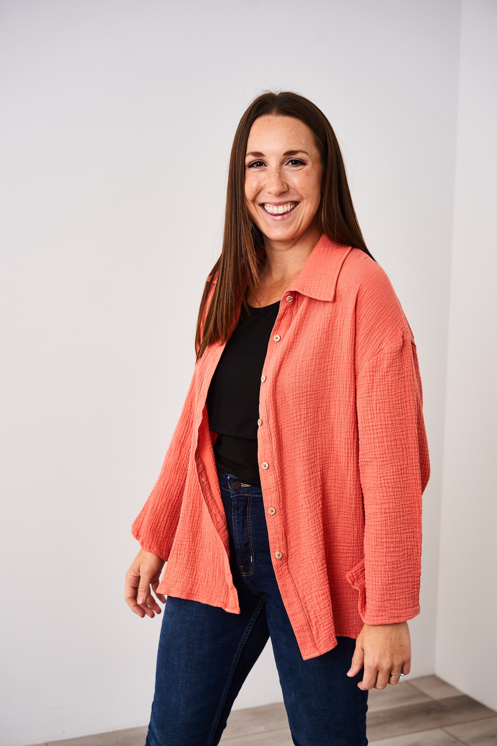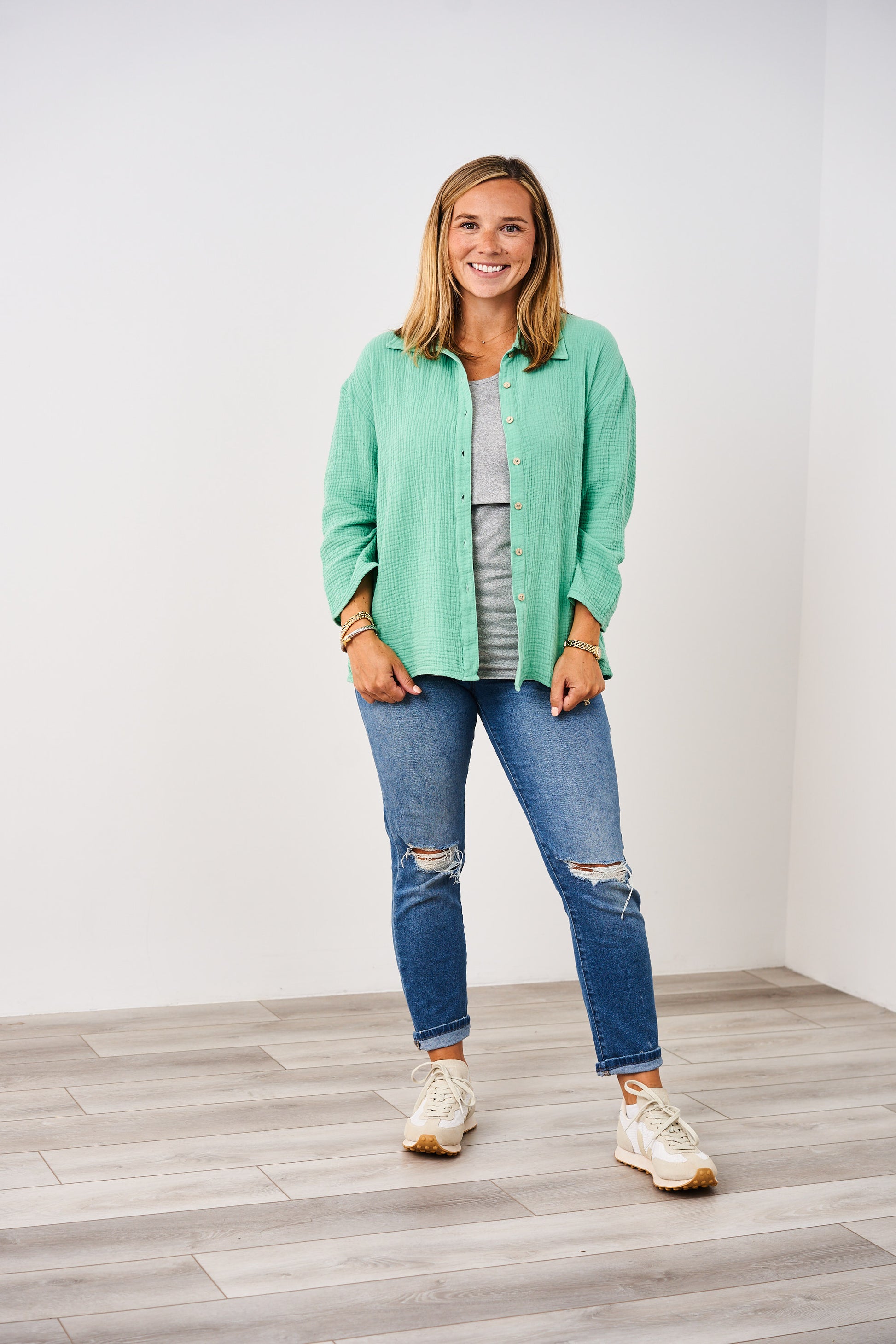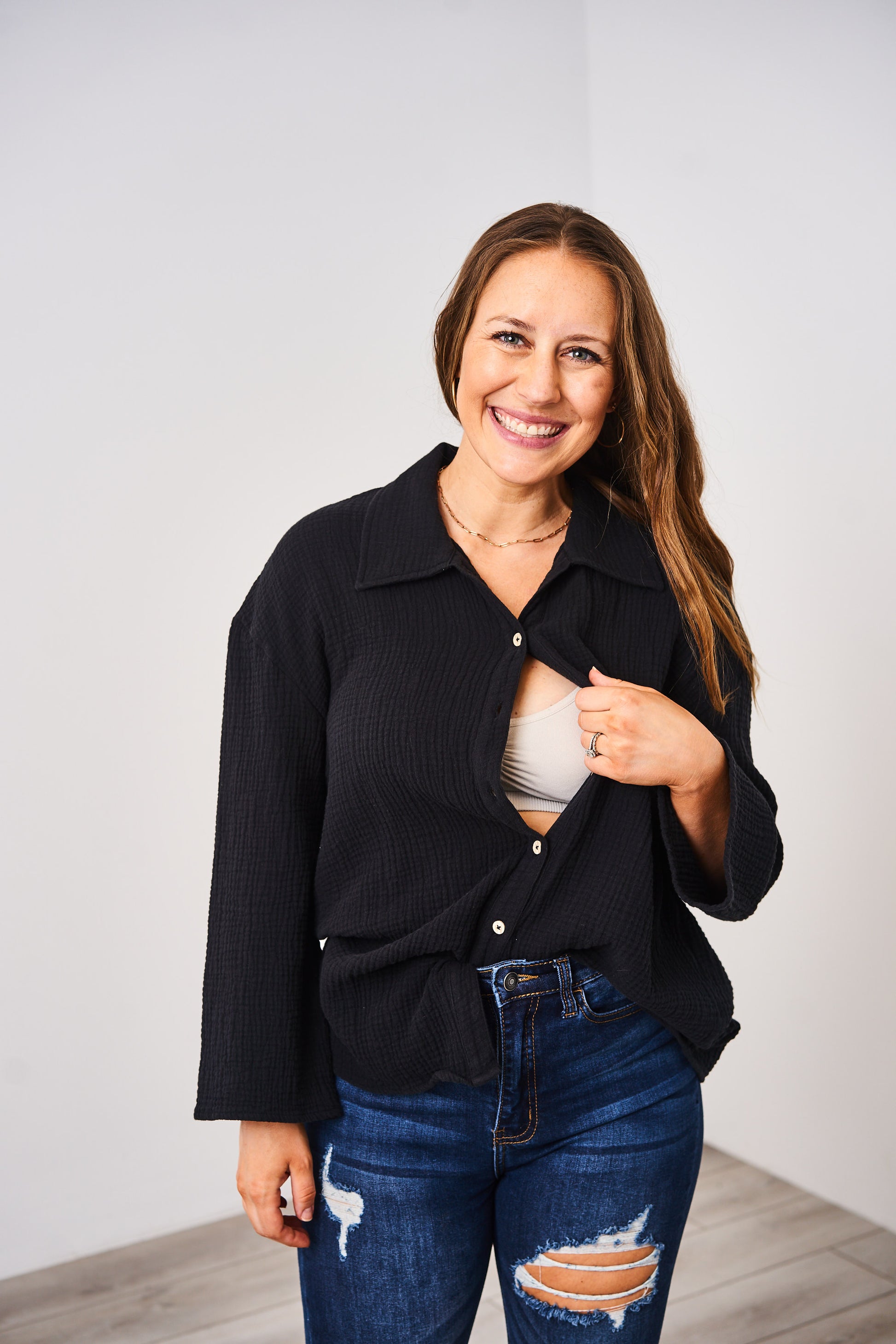 Whether you’re enjoying cool breezes or dreaming of sunny skies, our Coastline Cotton Button-Down top is the perfect trendy top. Effortlessly stylish and light as a cloud, this comfy top will have you looking and feeling your best from pregnancy to postpartum and beyond!