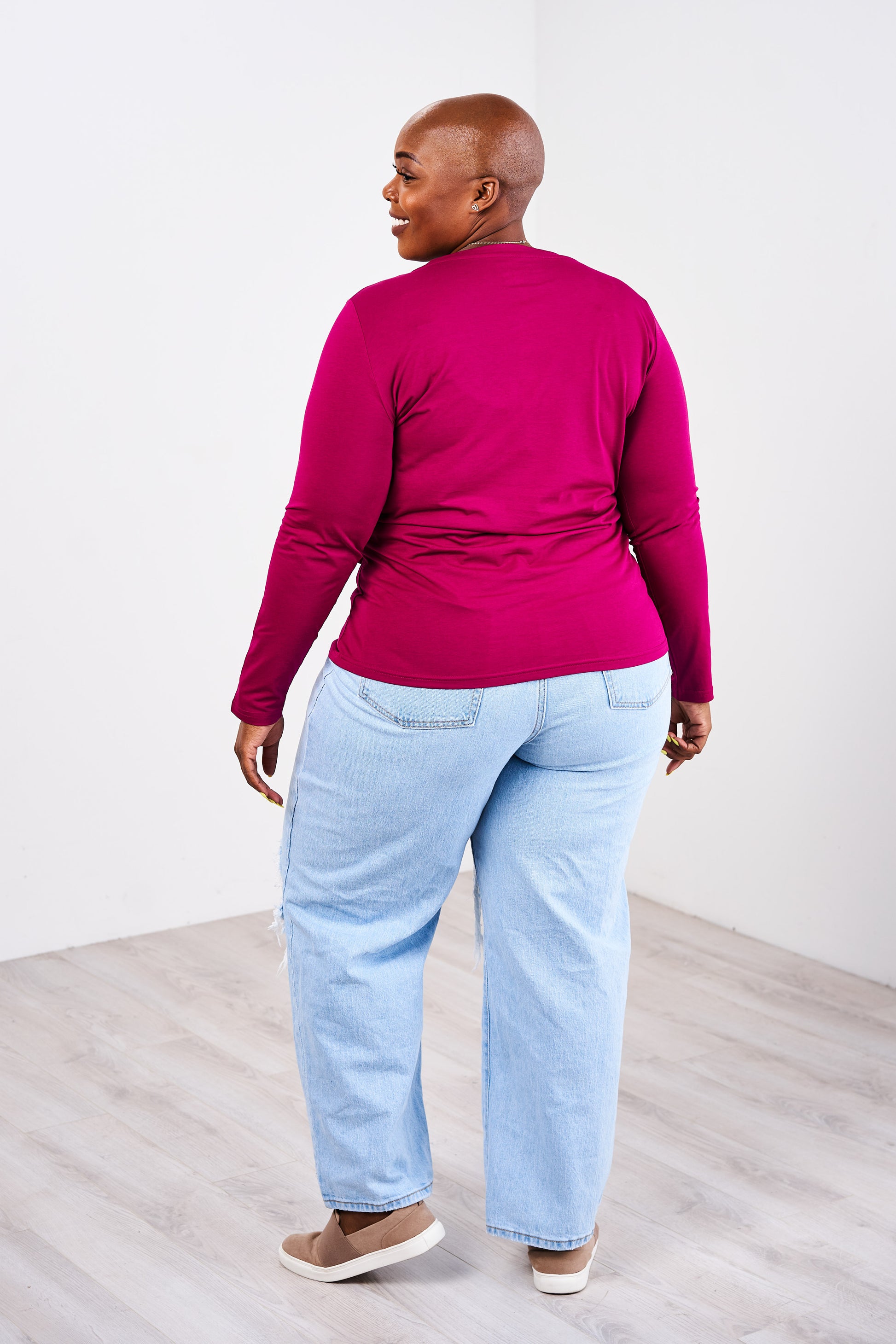 • Brittny is 5'8", 260 pounds, chest size 44/DD and is wearing 1X in Deep Magenta.