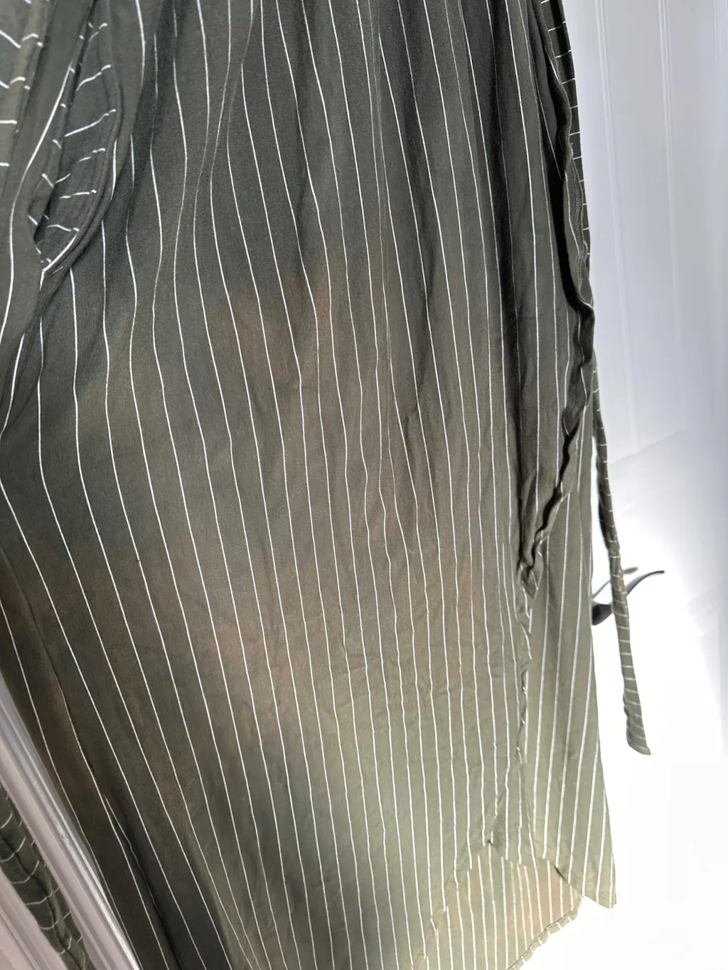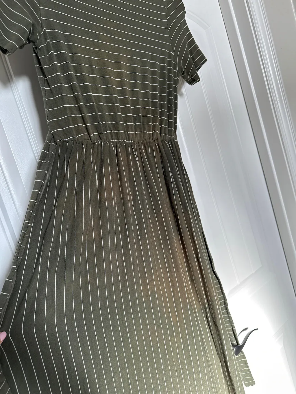 The dress is flattering and looks good while wearing. However, after one wash the dress has discolored sections all over. It’s quite disappointing to spend $70 on a dress and have poor quality material.