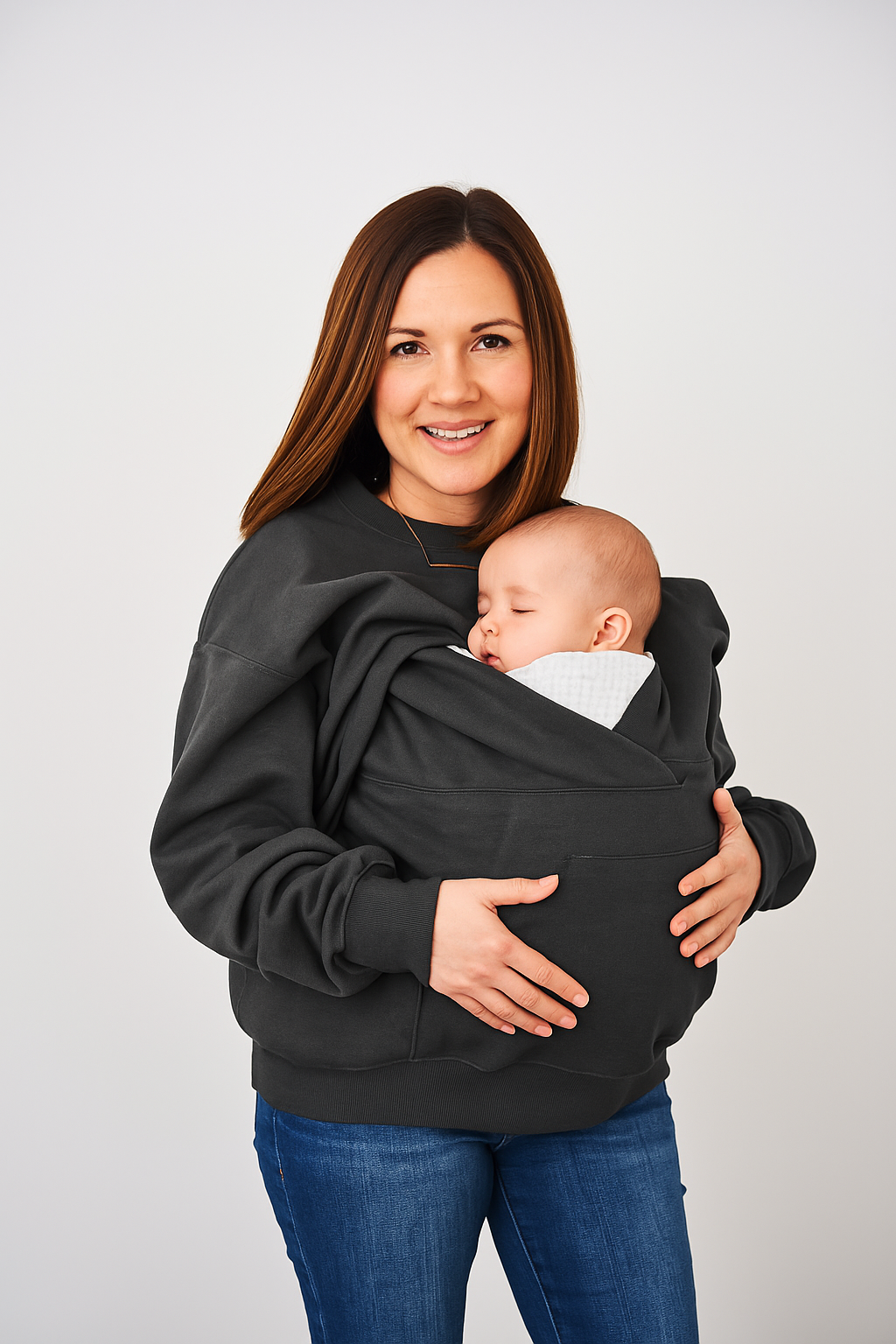 - If babywearing, we recommend sizing up 1-2 sizes! There is minimal stretch to the fabric. This garment is designed to be worn over your structured carrier or wrap. It does not offer your child support.