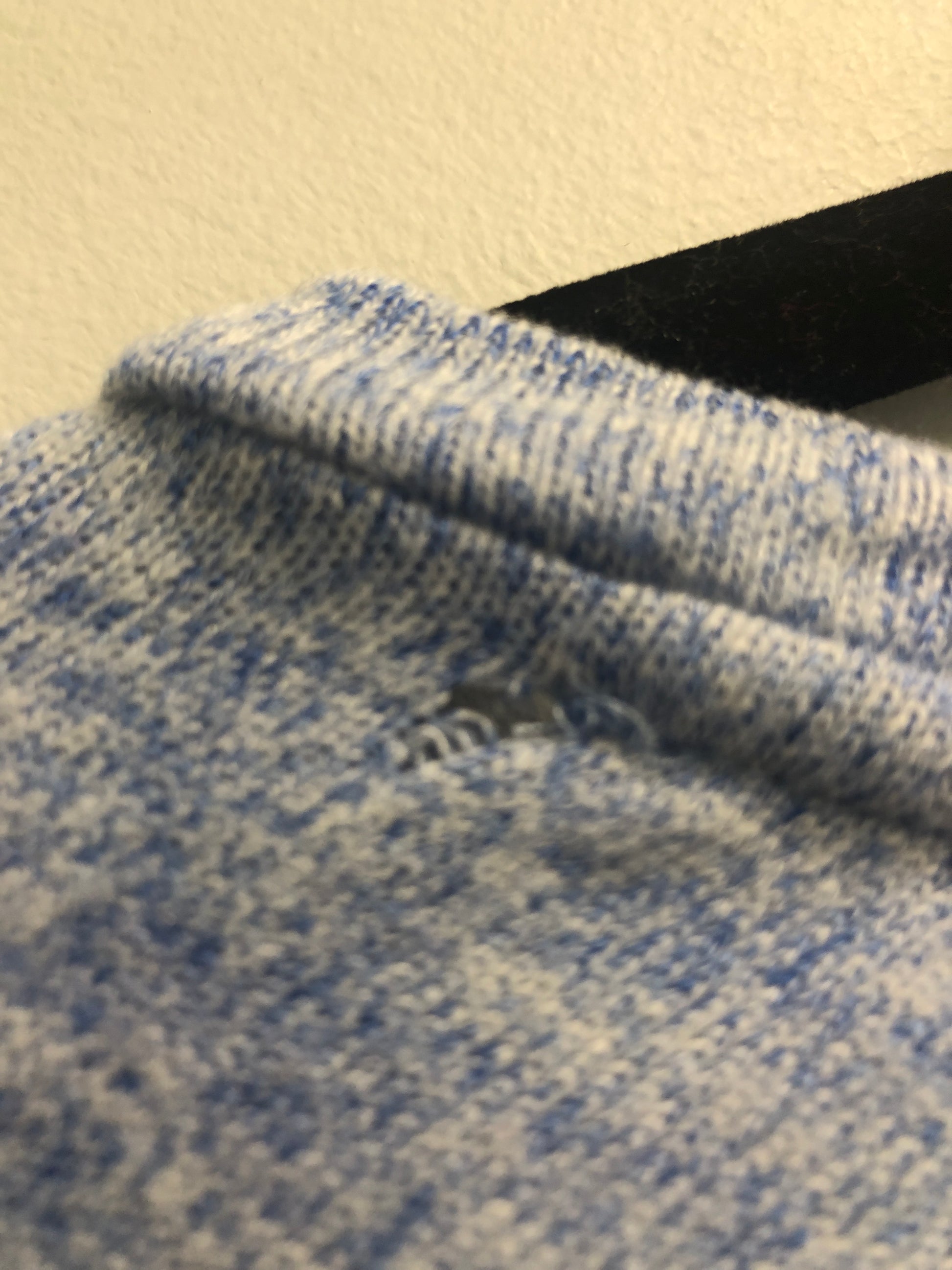 This item has been worn and has a small hole under the collar on the left side on the back of the garment.