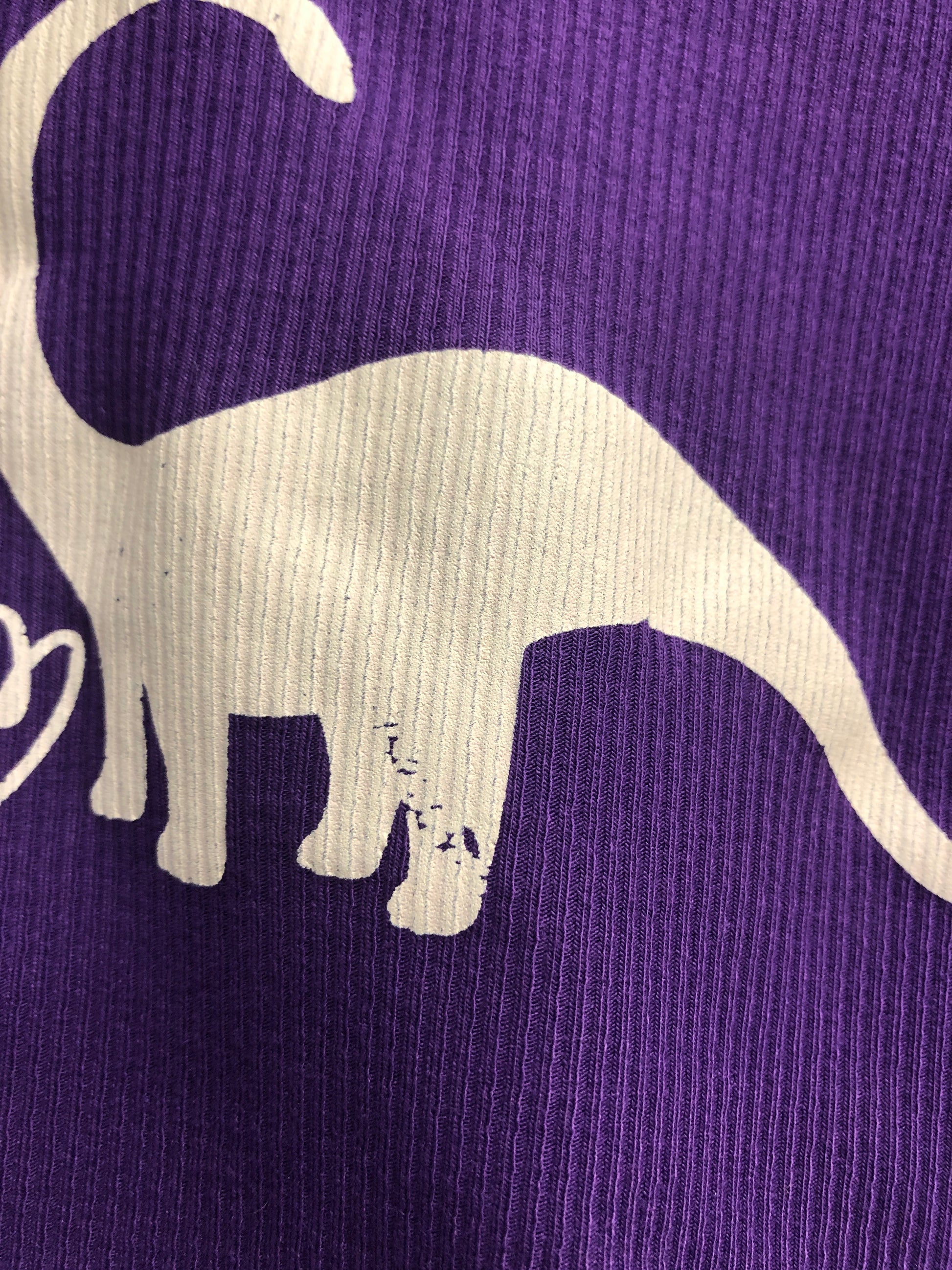 This item is new and has been customized with the Retro Dino Family screenprint. The screenprint did not fully adhere on the Mama Dino.