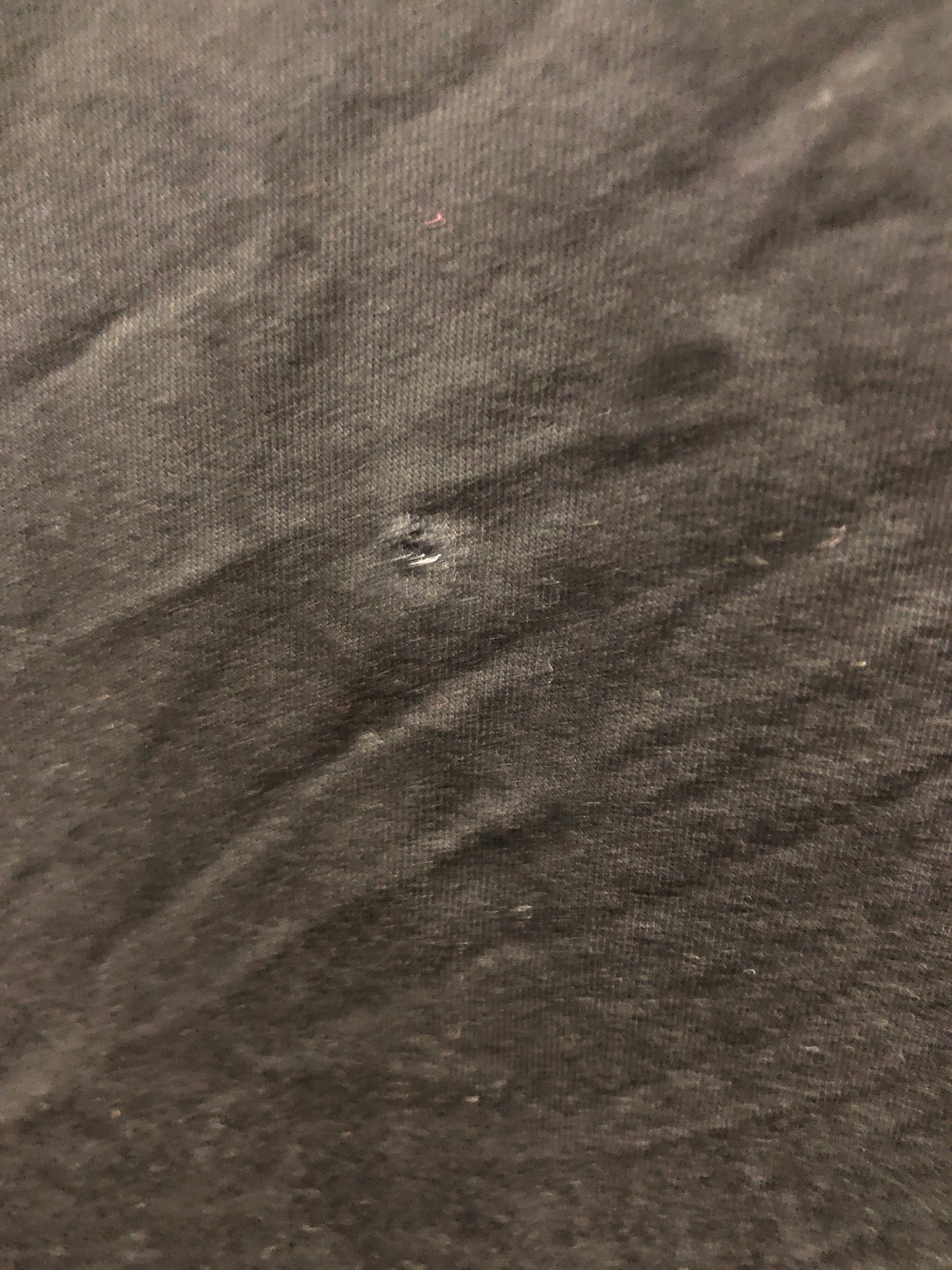 This item has been worn and there is a small hole in the fabric on the bottom front of the dress.