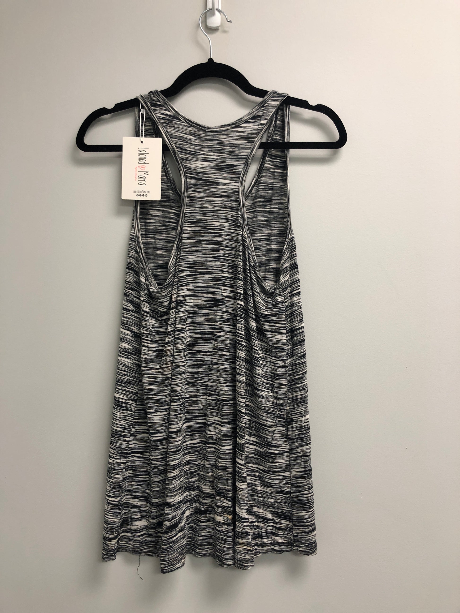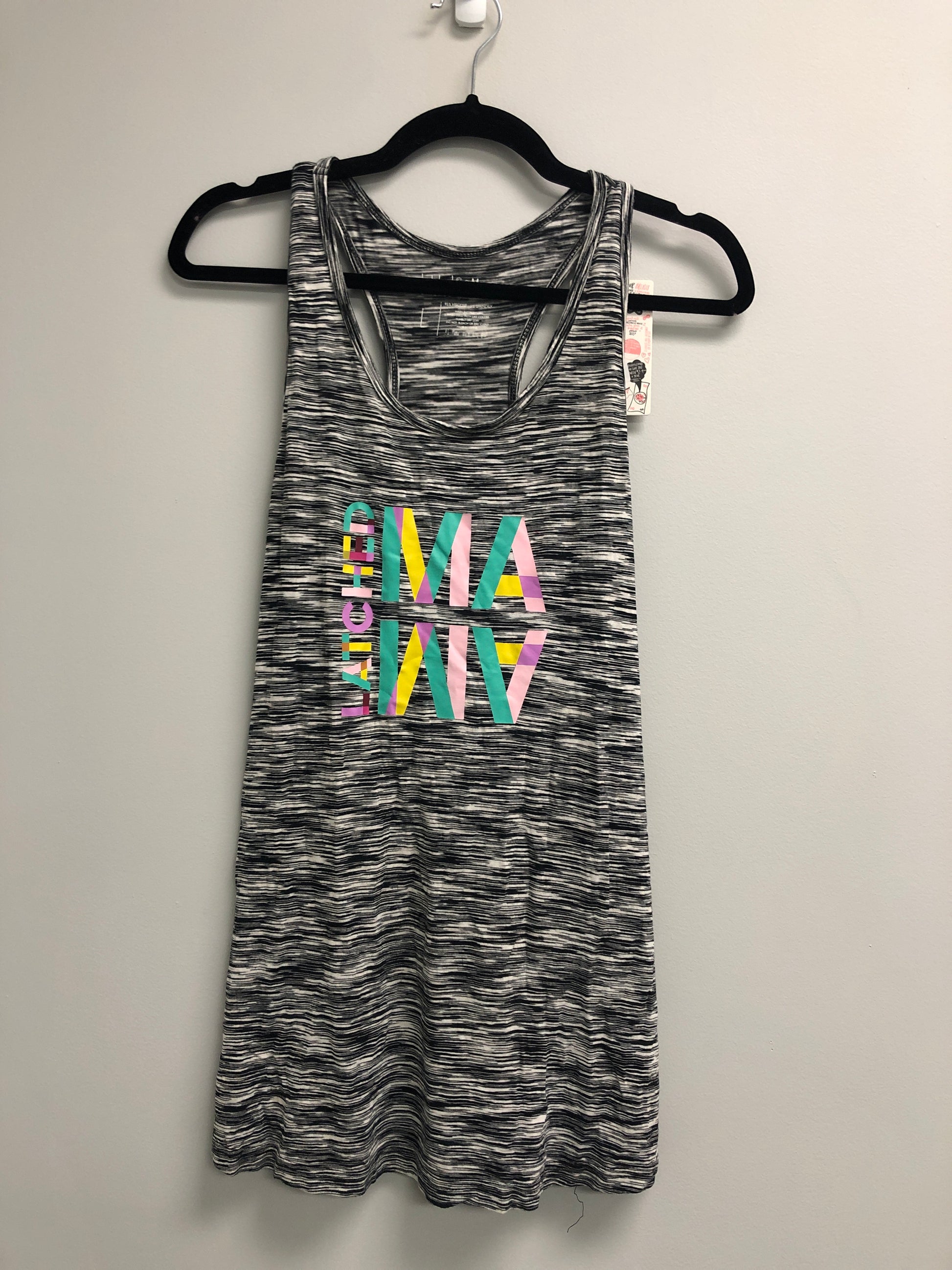This item is a non nursing racerback tank top that was made for a Latched Mama Staff shirt. The tank is a black and white print with a Latched Mama print on the front.