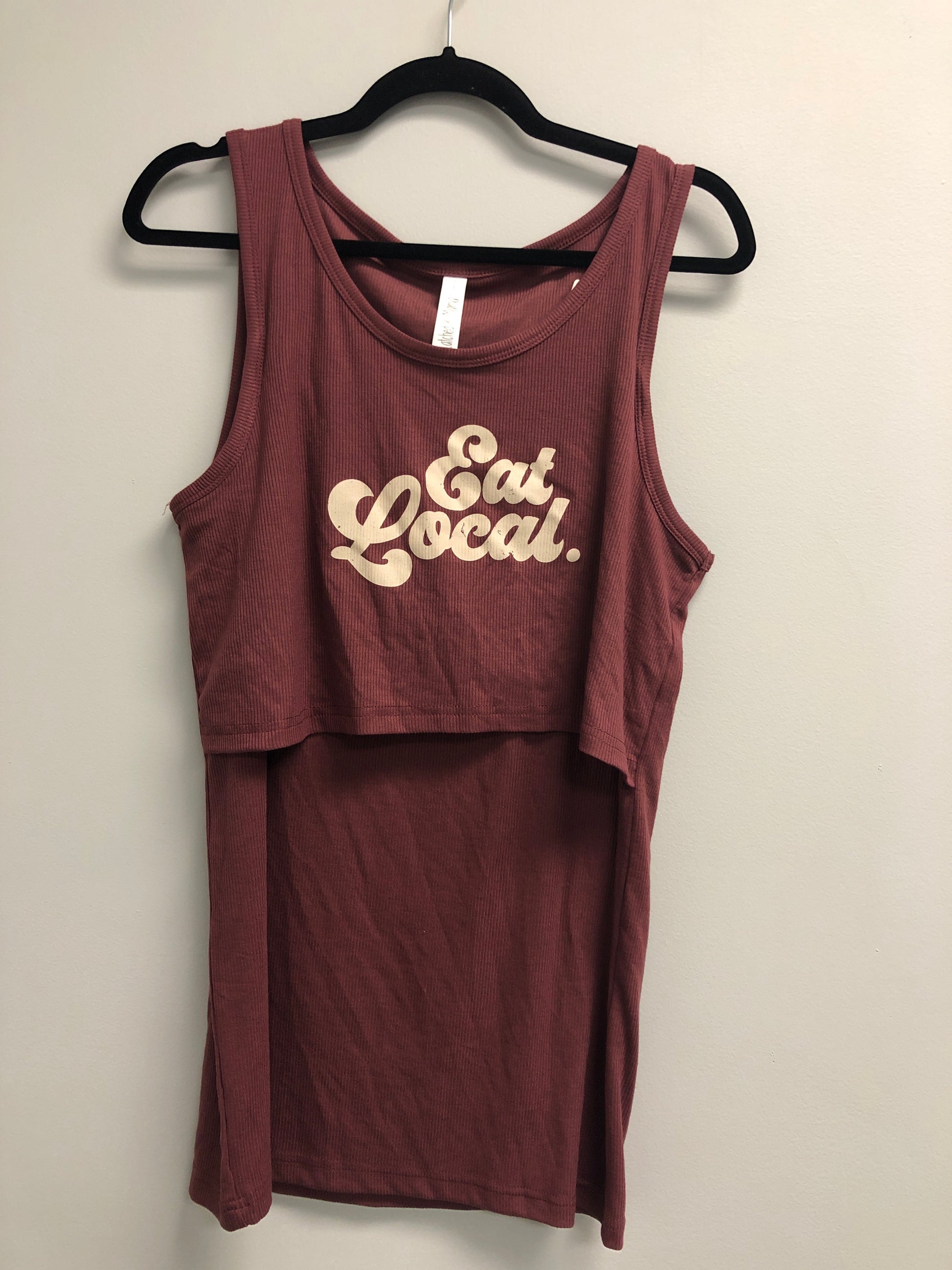 This item has been customized with the Eat Local heat press design.