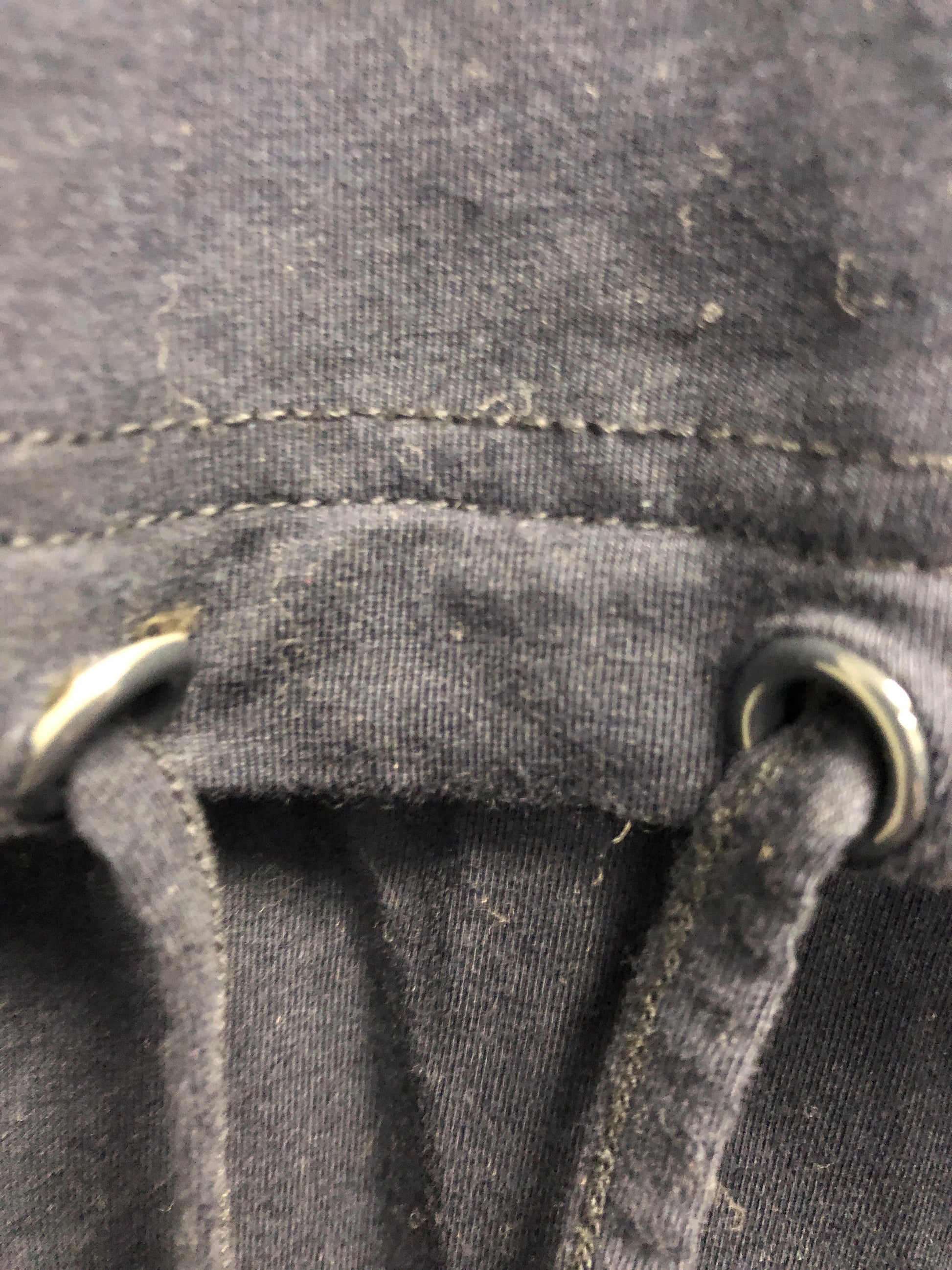 This item has been worn, washed, and the rivets on drawstrings are coming apart.